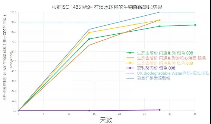 相比于傳統(tǒng)的PET閃粉,生態(tài)金蔥粉的外觀上色彩與亮度都毫不遜色傳統(tǒng)閃粉,同時它能在自然環(huán)境中的達(dá)到生物降解,不會對環(huán)境造成污染,它的環(huán)?!熬G色認(rèn)證書”Bioglitter?Logo的加持,更能為品牌增加辨識度及獲得更多的附加值。生態(tài)金蔥粉閃耀系列的生物可降解率達(dá)到87%;純凈系列的生物可降解率達(dá)到92%,并獲得 TüV 授予的“OK Biodegradable WATER”的生物可降解認(rèn)證。生態(tài)金蔥粉對海洋環(huán)境最常見的影響途徑是:廢水-> 水處理-> 淡水-> 海水.在整個路線中,生態(tài)金蔥粉將進(jìn)行生物降解,使其實(shí)際到達(dá)海洋的可能性極低。
